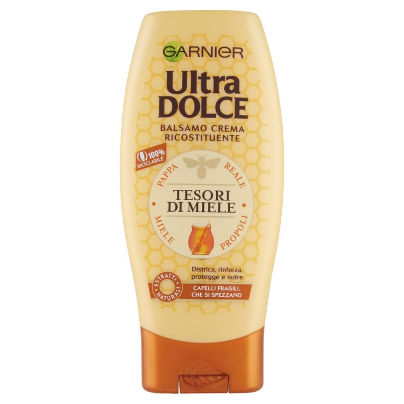 - Per la sua ricetta ricostituente, appositamente preparata per il trattamento dei capelli fragili, che si spezzano, Garnier Ultra Dolce raccoglie 3 tesori dall'alveare: la pappa reale riparatrice, elisir rivitalizzante conosciuto per rinforzare i capelli dalla radice; la propoli ricostituente, vero collante naturale prodotto dalle api, conosciuto per le sue proprieta' lenitive, e il miele nutritivo, nettare millenario da sempre conosciuto per la sua dolcezza e proprieta' nutritive. Intensamente nutriti, protetti e riparati dalle radici alle punte, i capelli trovano nuova forza. Piu' forti e brillanti, sono morbidi e facili da pettinare, risplendono di bellezza! / Ingredienti: 1149956 E - Ingredients:, Aqua / Water, Cetyl Alcohol, PEG-180, CI 19140 / Yellow 5, CI 15985 / Yellow 6, Elaeis Guineensis Oil / Palm Oil, Alcohol, Hydroxyethylcellulose, Dodecene, Stearyl Alcohol, Mel / Honey, Chlorhexidine Digluconate, Poloxamer 407, Limonene, Benzyl Alcohol, Benzyl Salicylate, Isopropyl Myristate, Isostearyl Alcohol, 2-Oleamido-1,3-Octadecanediol, Propolis Extract, Myrtistyl Alcohol, Cetrimonium Chloride, Cetyl Esters, BHT, Citric Acid, Lauryl PEG/PPG-18/18 Methicone, Coumarin, Royal Jelly, Glycerin, Parfum / Fragrance, (C164325/4)