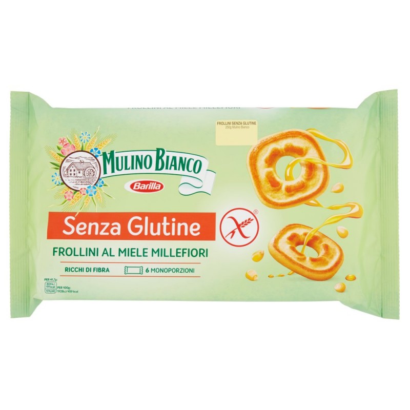 Tutto il buono Senza Glutine / I frollini al miele Senza Glutine racchiudono tutta la dolcezza e la bonta' del miele millefiori in una porzione ideale per la colazione o per lo snack. / Dedicati a chi deve scegliere alimenti privi di glutine ma non vuole rinunciare alla bonta' di Mulino Bianco. / / Ricchi di fibra / con ingredienti privi di glutine / 6 biscotti in monoporzioni da 191 Kcal / Ingredienti: Fecola di patata, Amido, Farina di mais, Zucchero, Olio di semi di girasole, Miele 2,9%, Uova fresche, Aromi (latte), Latte scremato in polvere, Agenti lievitanti (carbonato acido d'ammonio, carbonato acido di sodio), Proteine del latte, Sale, Emulsionante: lecitina di girasole, Puo' contenere tracce di soia