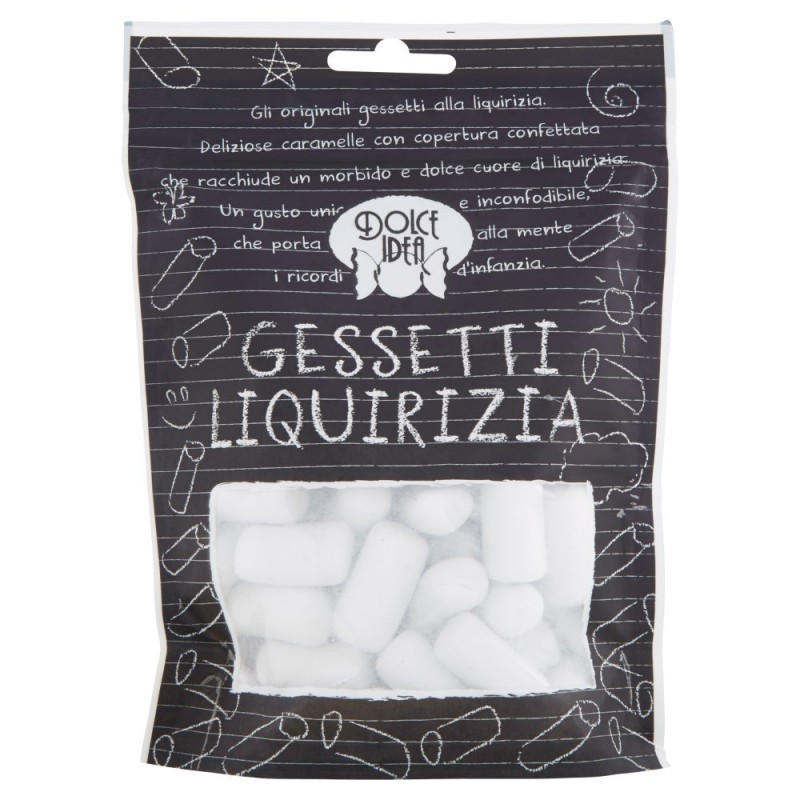 - Gli originali gessetti alla liquirizia. Deliziose caramelle con copertura confettata che racchiude un morbido e dolce cuore di liquirizia. Un gusto unico e inconfondibile, che porta alla mente ricordi d'infanzia. / Ingredienti: Zucchero, Sciroppo di glucosio, Melassa di canna da zucchero (contiene solfiti), Farina di frumento, Grassi vegetali (palma), Amido modificato di mais, Estratto di liquirizia, Latte intero in polvere, Cloruro di ammonio, Sale, Gelatina, Aromi, Olio vegetale (cocco), Agenti di rivestimento: cera carnauba, gomma arabica, colorante: E171