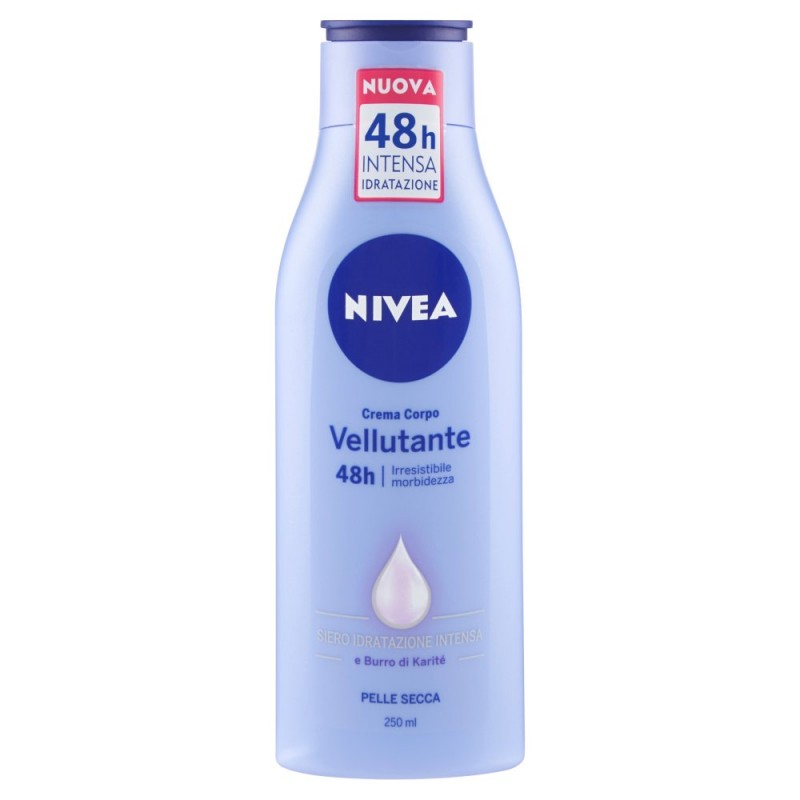 - Texture: 3 su 5 / / Rende la pelle secca visibilmente piu' morbida per 48h / - Nivea Crema Corpo Vellutante e' arricchita con Nivea Siero Idratazione Intensa e prezioso Burro di Karite'. / - Penetra nella tua pelle lasciandola morbida al tatto e intensamente idratata per 48h - dopo una sola applicazione. / / Siero idratazione intensa / La formula mantiene l'idratazione in profondita', per una pelle visibilmente piu' morbida per 48h. Formula senza parabeni. / Ingredienti: Aqua, Glycerin, Cetearyl Alcohol, C15-19 Alkane, Isopropyl Palmitate, Paraffinum Liquidum, Glyceryl Stearate SE, Butyrospermum Parkii Butter, Dimethicone, Glyceryl Stearate, Sodium Cetearyl Sulfate, Sodium Hydroxide, Carbomer, Phenoxyethanol, Ethylhexylglycerin, Linalool, Limonene, Butylphenyl Methylpropional, Benzyl Alcohol, Citronellol, Alpha-Isomethyl Ionone, Parfum