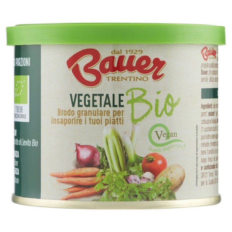 Con il Granulare Istantaneo Vegetale Bio Bauer prepari un brodo buono come quello che piace a te. Grazie al prezioso estratto di lievito Biologico, ingrediente dalle pregiate qualita' nutrizionali, e' ideale per brodi e minestre pronte in pochi minuti per insaporire tutti i tuoi piatti. Bauer, che produce in Trentino dal 1929, e' certificata ICEA - Istituto per la Certificazione Etica e Ambientale - perche' utilizza solo materie prime certificate, con severi controlli in ogni fase della produzione. / Ingredienti: Sale marino, Verdure disidratate in proporzione variabile (patata*, carota*, cipolla*, prezzemolo*, porro*, sedano*, aglio*, pomodoro*): 26%, Estratto di lievito*: 16%, Olio di semi di girasole*, *Ingrediente da coltivazione biologica