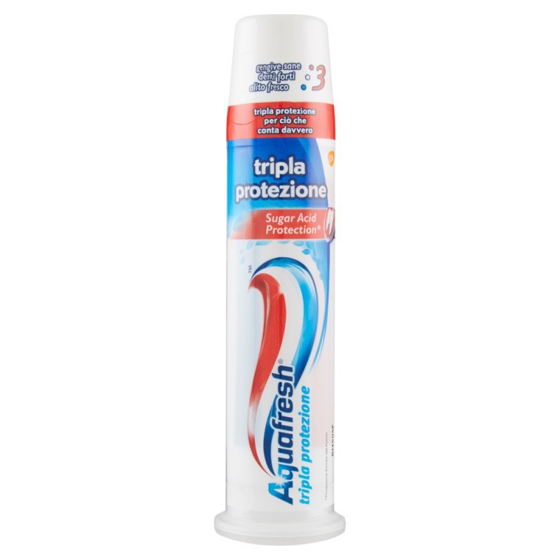 Il dentifricio Aquafresh Tripla Protezione e' un dentifricio 3-in-1 dal gusto fresco per tutta la famiglia, con Sugar Acid Protection grazie al fluoro che aiuta a proteggere dagli acidi presenti nella placca e derivati dagli zuccheri, la principale causa della carie. Quando ti lavi i denti con il nostro dentifricio dall'ottimo gusto, a livello microscopico i minerali di fluoro attivo vengono assorbiti dai tuoi denti, finforzandoli ed irrobustendoli. Cio' crea uno scudo protettivo che aiuta a bloccare l'attacco degli acidi derivati dagli zuccheri. / Ingredienti: Aqua, Hydrated silica, Sorbitol, Glycerin, PEG-6, Sodium lauryl sulfate, Aroma, Xanthan gum, Titanium dioxide, Sodium fluoride, Sodium saccharin, Acrylates/C10-30 alkyl acrylate crosspolymer, Carrageenan, Sodium hydroxide, Limonene, CI 73360, CI 74160, Contiene: fluoruro di sodio (1450ppm fluoruro)