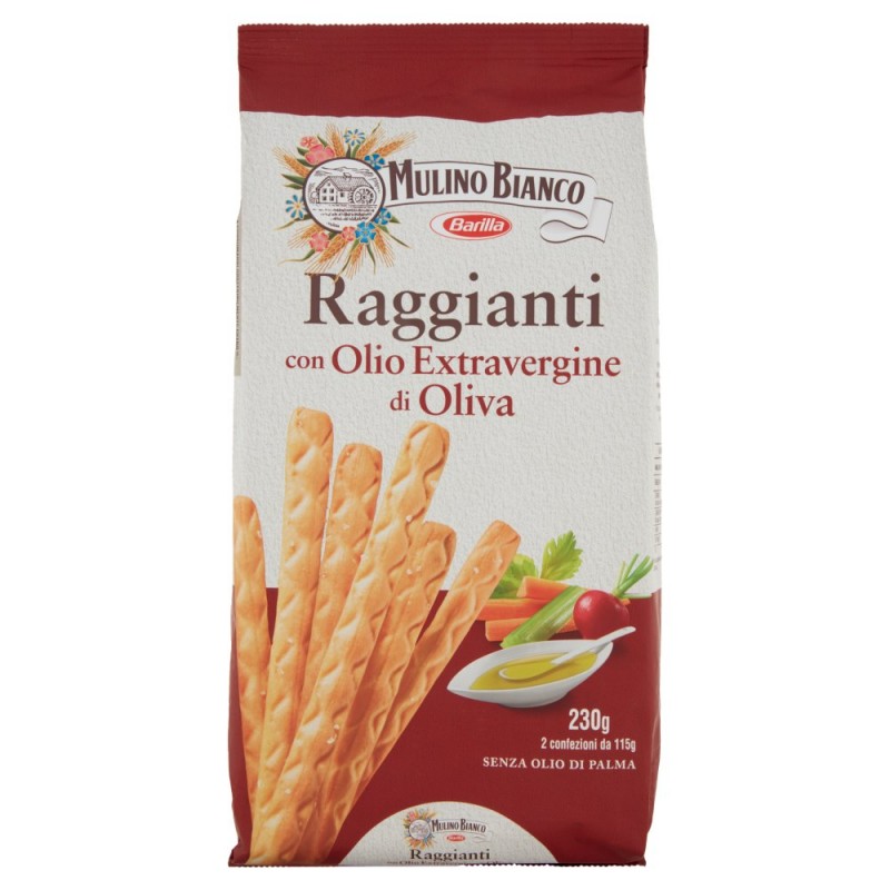 Tutto il buono che senti / Olio extra vergine di oliva + Farina di grano tenero / Dall'incontro tra la farina di grano tenero e l'olio extravergine di oliva nascono i Raggianti: croccanti e gustosi, ideali per accompagnare i tuoi pasti. / www.mulinobianco.it / / Il buono che non vedi / - Tutti i nostri grissini sono senza grassi idrogenati, senza coloranti e senza olio di palma. / - Per la nostra produzione acquistiamo 100% energia elettrica da fonti rinnovabili. / Ingredienti: Farina di grano tenero tipo ''0'' 95g*, Olio extravergine di oliva 7,5g*, Lievito, Olio di girasole, Sale, Estratto di malto d'orzo e mais, *per 100 grammi di prodotto finito, Puo' contenere tracce di: frutta a guscio, latte, sesamo, soia e uova