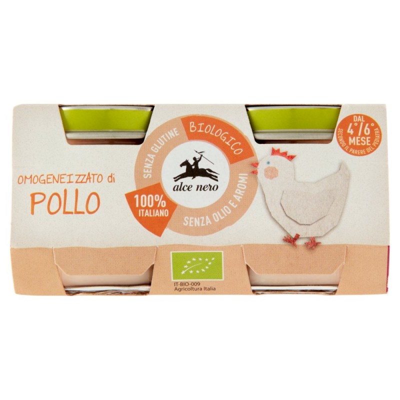 - Alce Nero informa: l'OMS raccomanda di prediligere, ove possibile, l'allattamento al seno per almeno i primi 6 mesi di vita. Chiedi sempre un parere al tuo pediatra sulle dosi e i tempi di introduzione degli omogeneizzati. Ricorda che lo svezzamento e' un momento unico nella vita del tuo bambino dove, oltre a imparare a nutrirsi, scopre i gusti e compie i primi passi verso la propria autonomia. / / Conosci meglio l'omogeneizzato di pollo Alce Nero / Caratteristiche: pollo biologico. Territori di provenienza: da allevamenti italiani. Tipo di allevamento: il pollo biologico viene allevato con spazio a disposizione per razzolare. Tipo di lavorazione: dopo essere stata lavorata, la carne di pollo viene omogeneizzata per renderla facilmente deglutibile. Una volta confezionati i vasetti vengono sottoposti ad un trattamento termico che ne garantisce la stabilita' nel tempo. / / Sul sito troverai altri dettagli sui nostri omogeneizzati, consigli e ricette: www.alcenero.com / Ingredienti: Acqua di cottura, Carne di pollo* (40%), Amido di riso*, Succo di limone*, *Biologico, Senza glutine, L'amido di riso serve per dare all'omogeneizzato la giusta consistenza