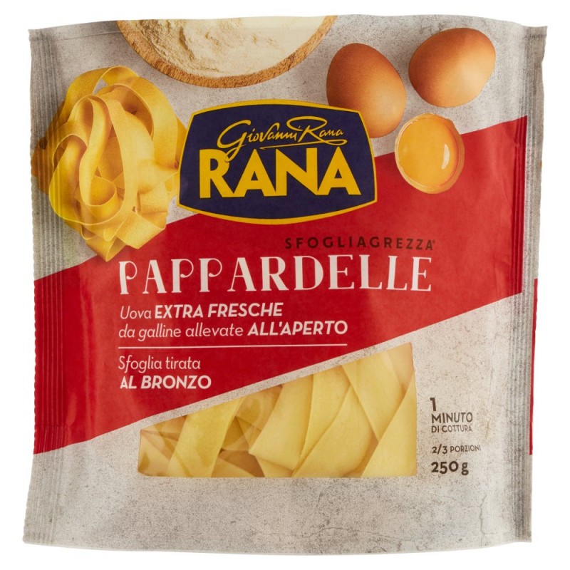 Uova extra fresche / Da galline allevate all'aperto / Per le nostre Pappardelle scegliamo uova da allevamenti che rispettino il benessere animale e garantiscano alle galline grande liberta' di muoversi, di razzolare e di esprimere comportamenti naturali. / / Mangimi 100% vegetali / Le galline sono alimentate con una selezione di mangimi 100% vegetali, senza l'aggiunta di coloranti artificiali. / Ingredienti: Semola di grano duro, Uova 18%, Acqua