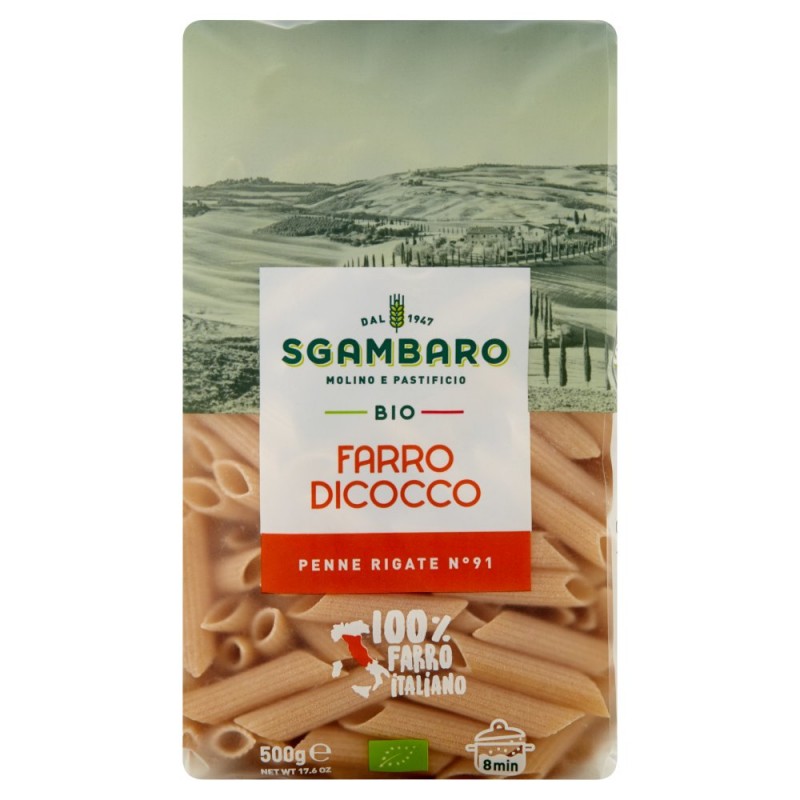 Il farro dicocco e' un cereale molto antico, tra i piu' importanti della storia. Ha mantenuto inalterato il suo patrimonio genetico per millenni e si distingue per il gusto delicato e la capacita' di sposarsi ai condimenti piu' diversi. / / Farro Dicocco Penne Rigate N° 91 / Trafilate in bronzo / Ingredienti: Sfarinato di farro dicocco italiano biologico (grano)
