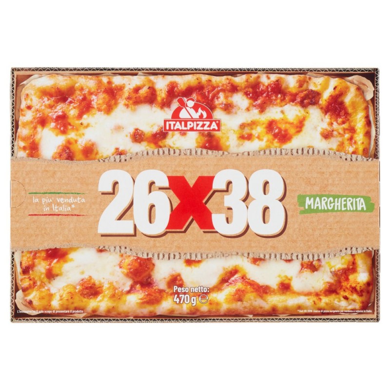 Impasto (farina di grano tenero, acqua, olio extra vergine di oliva, sale, lievito), Mozzarella 26% (latte, sale, caglio microbico, fermenti lattici), Salsa di pomodoro 21% (polpa di pomodoro, zucchero, sale), Olio di semi di girasole, Puo' contenere tracce di soia
