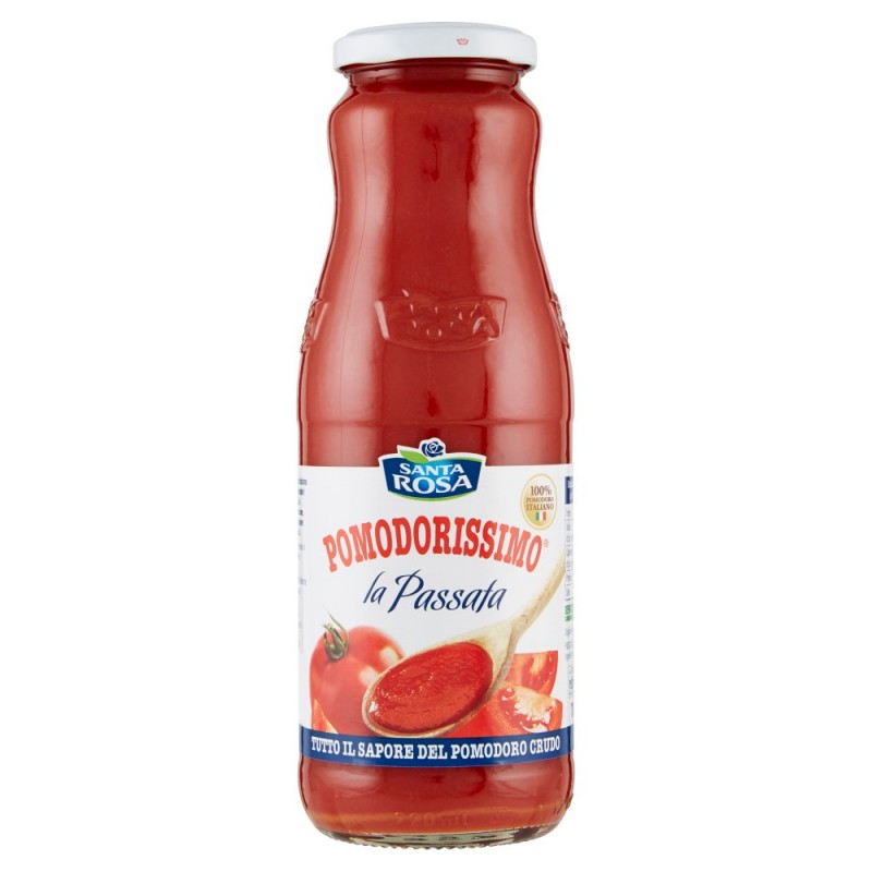La Passata Pomodorissimo e' fatta solo con pomodori freschi e, grazie alla particolare lavorazione, conserva tutto il sapore del pomodoro crudo. / Ingredienti: Pomodori, Sale