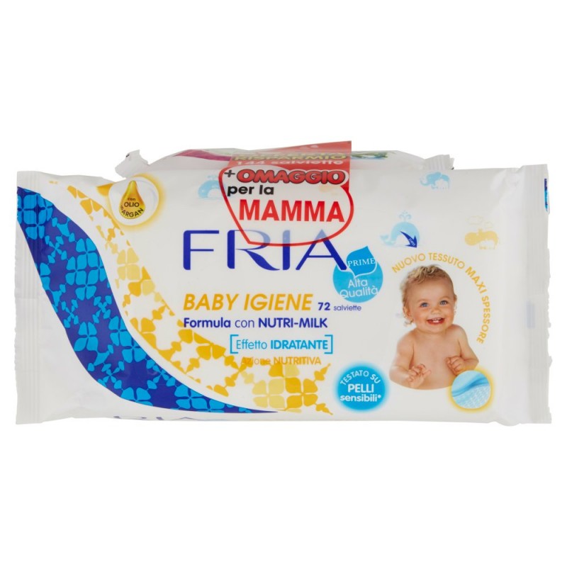 - [Il Prodotto] Mamme Informate e Bimbi Protetti / La sicurezza dei prodotti per bambini e' cio' che ogni mamma cerca per i propri figli, soprattutto per l'igiene quotidiana. Le nuovissime salviette Fria Baby Igiene nascono dalla particolare ricerca di un prodotto innovativo di altissima qualita', appositamente studiato per soddisfare le esigenze della delicata epidermide dei neonati. La particolare formulazione con complesso Nutri-Milk, ottenuto dalla sinergia tra Latte Integrale di Riso, Allantoina e Burro di Karite', contribuisce a conferire idratazione lasciando un sottile strato protettivo che dona morbidezza alla pelle garantendo la sicurezza di un prodotto delicato e ben tollerato. Grazie all'Olio di Argan ricco in acidi grassi, antiossidanti naturali dalle eccellenti proprieta', dopo l'operazione di detersione non e' necessaria l'aggiunta di creme o lozioni idratanti. Comode ed utili in ogni momento della giornata svolgono una completa e delicata azione igienica dell'epidermide senza alterare il naturale pH fisiologico del bambino. / / [L'Innovazione] Nuovo Tessuto Maxispessore Ultrasoffice e Ultraresistente / Le salviette Fria Baby Igiene sono realizzate in esclusivo tessuto Maxi Spessore che ne caratterizza la speciale morbidezza a fronte di una particolare resistenza al momento dell'utilizzo garantendo delicatezza sull'epidermide dei neonati. / Una morbida carezza per il tuo bambino! / / [La Garanzia] / Formulazione dermatologicamente testata su pelli sensibili. / / Baby Igiene [Effetto Idratante] / - No PEG / - No siliconi / - No parabeni / - No allergeni** / - No saponi alcalini / - No fenossietanolo / **Non presenti allergeni da dichiarare secondo quanto prevista dalla vigente normativa in materia. No PEG. No Fenossietanolo. pH fisiologico. / Ingredienti: Aqua, Lauryl Glucoside, Polyglyceryl-2 Dipolyhydroxystearate, Coco Glucoside, Hexyldecanol, Hexyldecyl Laurate, C12-15 Alkyl Benzoate, Argania Spinosa Oil, Butyrospermum Parkii Butter, Glycerin, Aloe Barbadensis Leaf Juice, Oryza Sativa Starch, Oryza Sativa Bran Oil, Hydrolyzed Rice Protein, Chamomilla Recutita Extract, Bisabolol, Allantoin, Tocopheryl Acetate, Sodium Benzoate, Potassium Sorbate, Tetrasodium Glutamate Diacetate, Parfum, Caprylyl Glycol, Xanthan Gum, Citric Acid