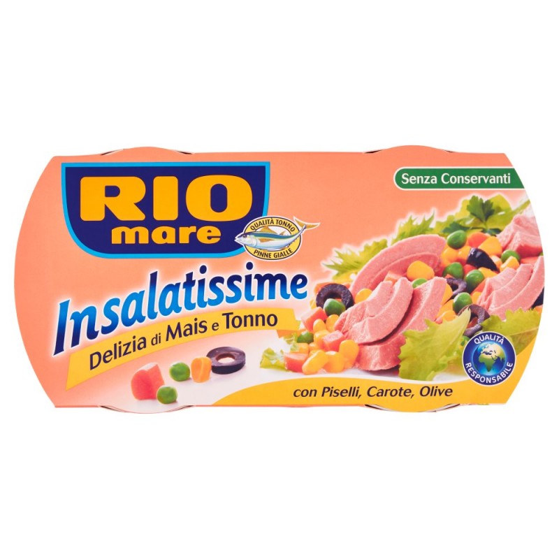 Mais 29%, Tonno a pinne gialle* 26%, Olio di semi di mais, Carote 11%, Piselli 11%, Olive nere 3%, Succo di limone, Sale, Puo' contenere glutine, *Thunnus (neothunnus) albacares
