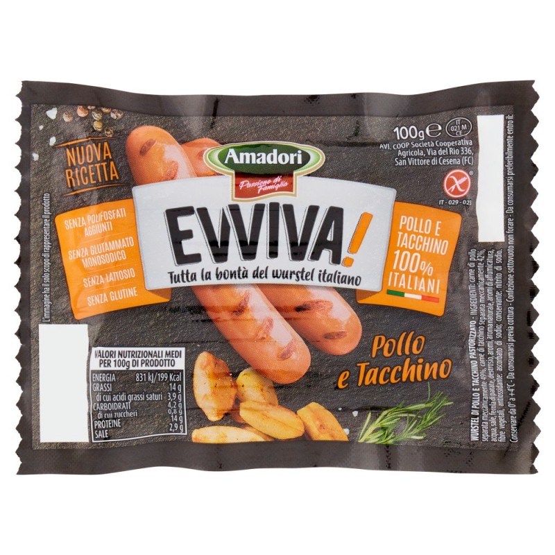 Carne di pollo separata meccanicamente 49%, Carne di tacchino separata meccanicamente 42%, Acqua, Sale, Fecola di patate, Destrosio, Aromi, Aroma naturale, Aromi di affumicatura, Fibre vegetali, Antiossidante: ascorbato di sodio, Conservante: nitrito di sodio