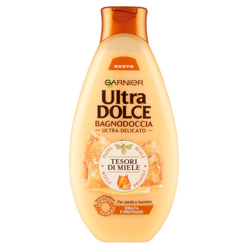 - Con i 3 tesori dell'alveare / Nella sua nuova ricetta protettiva, Garnier Ultra Dolce unisce i 3 preziosi tesori dell'alveare: / - La pappa reale, elisir rivitalizzante noto per le sue virtu' benefiche sulla pelle. / - La propoli, un incredibile collante naturale prodotto dalle api, dalle riconosciute virtu' protettive. / - Il miele, nettare millenario, noto per le sue proprieta' nutritive ed addolcenti. / La sua texture ricca si trasforma in una schiuma avvolgente per il piacere di tutta la famiglia*. Dopo la doccia la pelle splende di salute. / - pH neutro per la pelle. Adatto a tutta la famiglia*. / - Testato sotto controllo dermatologico. / *dall'eta' di 3 anni / / Un rituale goloso per una pelle protetta e idratata / Ingredienti: Aqua / Water, Sodium Laureth Sulfate, Coco-Betaine, Glycerin, Sodium Chloride, PPG-5-Ceteth-20, Parfum / Fragrance, Disodium Laureth Sulfosuccinate, Sodium Benzoate, PEG-150 Distearate, Salicylic Acid, Styrene/Acrylates Copolymer, Polyquaternium-7, Benzyl Alcohol, Limonene, Coumarin, Benzyl Salicylate, Mel / Honey, Royal Jelly, Propolis Extract, CI 19140 / Yellow 5, Alcohol, CI 14700 / Red 4, Sodium Hydroxide, Citric Acid, (F.I.L C186534/1)