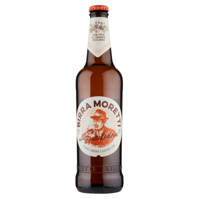 Ogni bottiglia di birra Moretti alla siciliana e' fatta in Italia con fiori di zagara siciliana, che le donano un gusto saporito, ricco di gradevoli sentori floreali e un aroma fine. / Nel rispetto degli ingredienti e della nostra ricetta. / Ingredienti: Acqua, Malto d'orzo italiano, Granoturco, Luppolo, Estratto di fiori di zagara siciliana, Estratto d'arancia