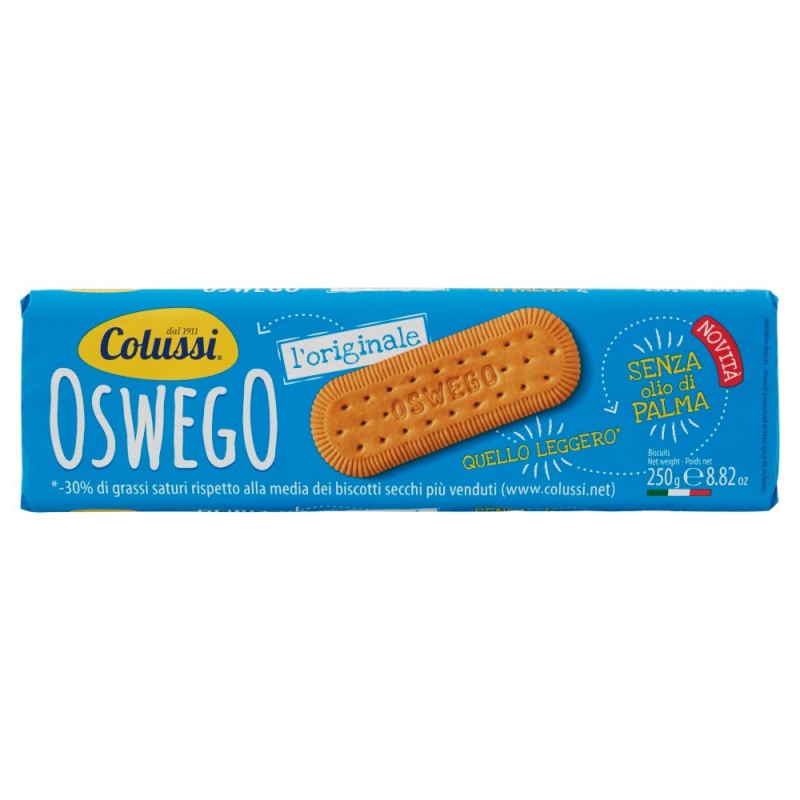 - Il gusto di sempre dell'Oswego Colussi da oggi e' senza olio di palma, con olio di girasole ed a ridotto contenuto di grassi saturi! / -30% Rispetto alla media dei biscotti secchi piu' venduti (www.colussi.net). / Ingredienti: Farina di frumento, Zucchero, Olio vegetale di girasole 8,5%, Latte scremato in polvere, Siero di latte in polvere, Sciroppo di glucosio, Destrosio, Emulsionante: lecitina di soia, Agenti lievitanti: carbonato acido d'ammonio - carbonato acido di sodio, Sale, Aromi, Puo' contenere uova