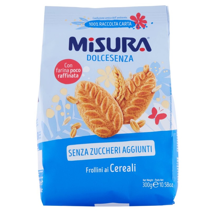Tutto il gusto dei cereali in un frollino dolce, friabile e senza zuccheri aggiunti! Chiudi gli occhi, mordi e goditi la dolcezza! / / Con farina tipo 2 / Fonte di fibre / Con uova fresche italiane da galline allevate a terra / Senza grassi idrogenati / Senza additivi conservanti e coloranti / Senza olio di palma / -55% di grassi saturi rispetto alla media dei frollini piu' venduti www.misura.it / Nessun Segreto, il buono e' tutto qui! / / Ricette buone, semplici e trasparenti / Ingredienti: Farine di cereali 66,5% (farina di grano tenero tipo '2' 59%, farina di mais 4,5%, farina di riso 1,5%, farina di fiocchi di grano farro 1,5%), Edulcoranti: maltitolo, sciroppo di maltitolo, Olio di girasole, Uova fresche da galline allevate a terra 3,5%, Cruschello di frumento, Estratto di malto d'orzo e mais, Agenti lievitanti: carbonato acido di ammonio, carbonato acido di sodio, Sale, Aromi, Puo' contenere soia, latte, semi di sesamo e frutta a guscio, Contiene naturalmente zuccheri, Il consumo eccessivo puo' avere effetti lassativi