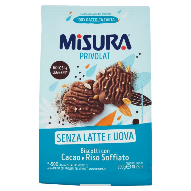 - Tutto il gusto fragrante del biscotto Privolat cacao e riso soffiato... un dolce momento di piacere per tutti, goloso e leggero*! / / Senza lattosio / / Nessun Segreto, il buono e' tutto qui! / Senza grassi idrogenati / Senza sciroppo di glucosio / Senza coloranti e conservanti / Fonte di fibre / *- 50% di grassi saturi rispetto alla media dei frollini piu' venduti. www.misura.it / Senza olio di palma / / Ricette buone, semplici e trasparenti / Ingredienti: Farina di frumento 59%, Zucchero, Olio di girasole, Granella di riso soffiato 5,5% (zucchero, riso), Cacao magro in polvere 4%, Agenti lievitanti: carbonato acido di ammonio, carbonato acido di sodio, difosfato disodico, Emulsionanti: lecitina di soia, Aromi, Sale