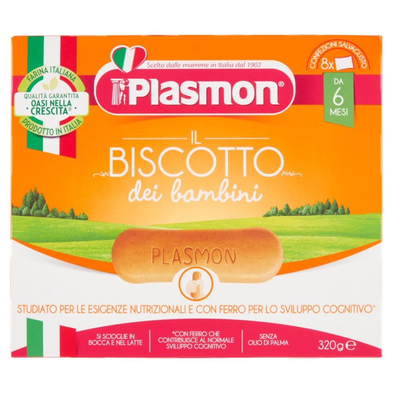Perche' scegliere il biscotto dei bambini? / Per la sua crescita / - Con calcio, vitamine del gruppo B selezionate e con ferro che contribuisce al normale sviluppo cognitivo e del sistema immunitario / Per migliorare la sua autonomia / - Con la sua forma unica studiata apposta per le manine del tuo bambino. Si scioglie in bocca grazie alla sua friabilita' unica / Farina italiana / - Solo farina italiana selezionata e attentamente controllata / Da Plasmon, per voi / - Sempre attenta al fabbisogno nutrizionale del tuo bambino, Plasmon regala una dolce coccola dal gusto inimitabile, amato anche dalle mamme e i papa' / / Il consumo del Biscotto Plasmon e' da intendersi all'interno di una dieta varia ed equilibrata e di uno stile di vita sano. / 15g di Biscotti Plasmon forniscono una quantita' significativa di ferro. / Ingredienti: Farina di frumento (63%), Zucchero, Oli vegetali (girasole, oliva), Latte scremato in polvere, Amido di frumento, Estratto di malto da orzo, Agenti lievitanti (carbonato acido di ammonio, carbonato acido di sodio, difosfato disodico), Calcio carbonato, Emulsionante: lecitina di girasole, Aromi, Ferro fumarato, Niacina, Riboflavina, Tiamina, Vitamina B6, Puo' contenere tracce di soia