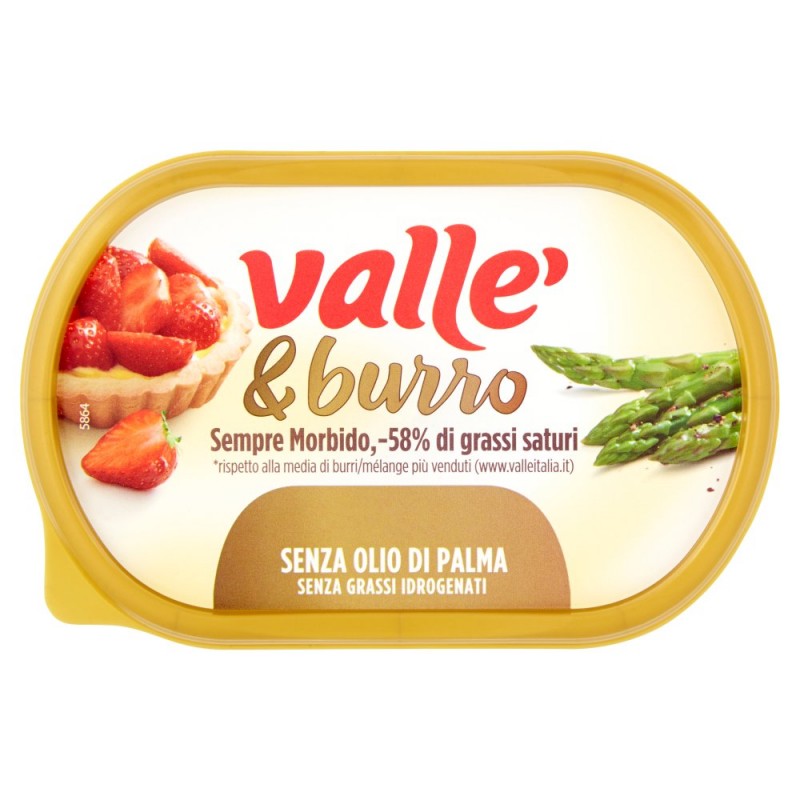- Senza grassi idrogenati / / Valle' & burro, dal sapore rotondo, piu' leggero e sempre morbido, garantisce risultati sorprendenti ad ogni tua ricetta dolce e salata. / Ingredienti: Oli e grassi vegetali 38% (semi di girasole, cocco, stearina di karite', paprica), Acqua, Burro (14,8%), Latte scremato reidratato, Emulsionanti (mono e digliceridi degli acidi grassi, lecitina di soia), Sale, Aroma, Conservante (sorbato di potassio), Correttore d'acidita' (acido lattico), Senza glutine**, ** come la maggior parte dei grassi da spalmare