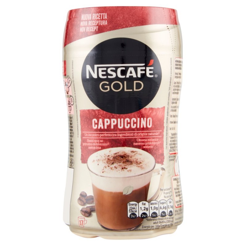 Scopri NESCAFE' GOLD Cappuccino, un incontro perfetto tra ingredienti di origine naturale? accuratamente selezionati per creare un cappuccino morbido e cremoso. Il nostro segreto e' la combinazione tra l'aroma ricco dei chicchi di caffe' Arabica e il gusto intenso della Robusta, uniti a una deliziosa e vellutata schiuma di latte per creare un'avvolgente esperienza dove vuoi e quando vuoi. / / - Cappuccino dalla schiuma soffice e cremosa / - Arricchito con pregiati chicchi di caffe' Arabica e Robusta / - Con schiuma vellutata, ottima per pause caffe' da leccarsi i baffi! / - Senza glutine / - Tutto il gusto della piu' classica bevanda da bar, senza uscire di casa / - Confezione da 250g per preparare circa 17 tazze / / Cerchi un gusto o un aroma diverso? / Con NESCAFE' trovi sempre il giusto caffe' per ogni occasione. / / Scopri di piu' sulla gamma di prodotti NESCAFE' su www.nescafe.it / Ingredienti: Zucchero?, Latte scremato in polvere? (22%), Sciroppo di glucosio?, Caffe'? 14% (caffe' solubile 13%, caffe' torrefatto e macinato 1%), Olio vegetale (cocco), Lattosio?, Correttori di acidita' (carbonati di sodio - acido citrico), Sale