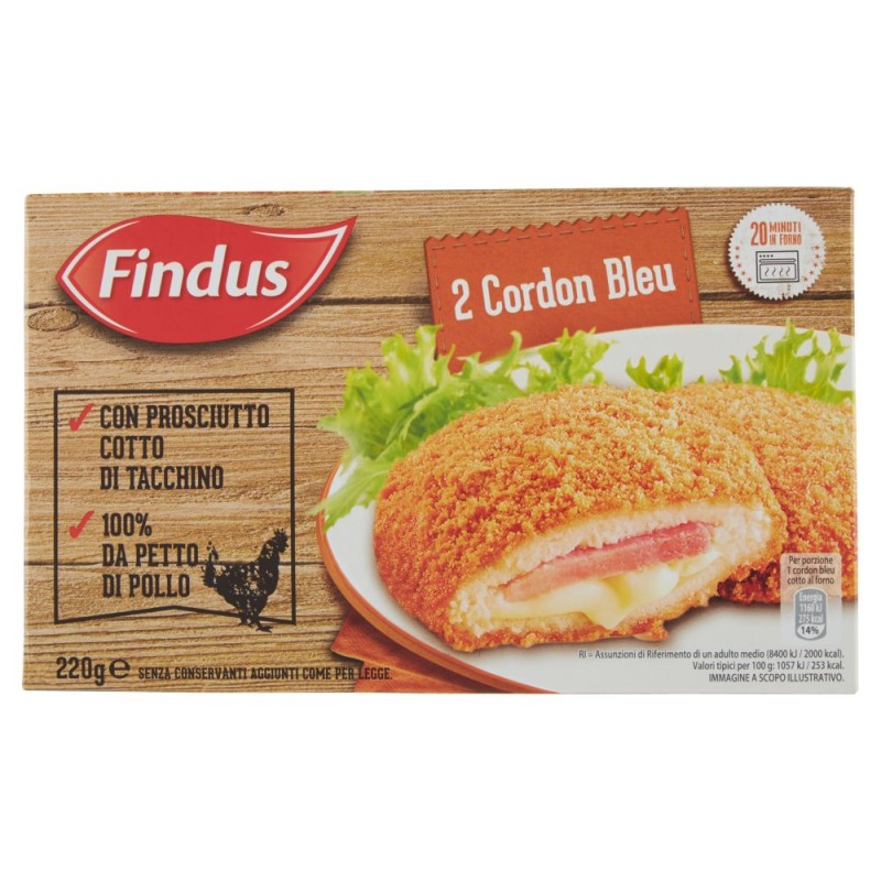 - Scopri le ricette di pollo Findus, tutte fatte con 100% petto di pollo e preparate con cura partendo da selezionati ingredienti di qualita', per garantirti piatti gustosi di cui ti puoi fidare. / / Come i Cordon Bleu Findus, teneri e gustosi petti di pollo ripieni di prosciutto cotto di tacchino e ricoperti da una croccante panatura. / Ideali per tutta la famiglia! / / - 100% da petto di pollo selezionato responsabilmente da aziende certificate / - Conservato con la sola azione del freddo / - Usiamo solo ingredienti di Alta Qualita', proprio come faresti a casa tua / Ingredienti: Petti di pollo 48%, Farina di frumento, Acqua, Formaggio Edam 10% (ingredienti: latte, sale, fermenti lattici, caglio), Olio vegetale di colza, Prosciutto cotto di tacchino 8% (ingredienti: carne di tacchino, acqua, sale, sciroppo di glucosio, pepe, aromi, conservanti: nitrito di sodio), Fibra di grano, Sale, Lievito, Paprica, Curcuma