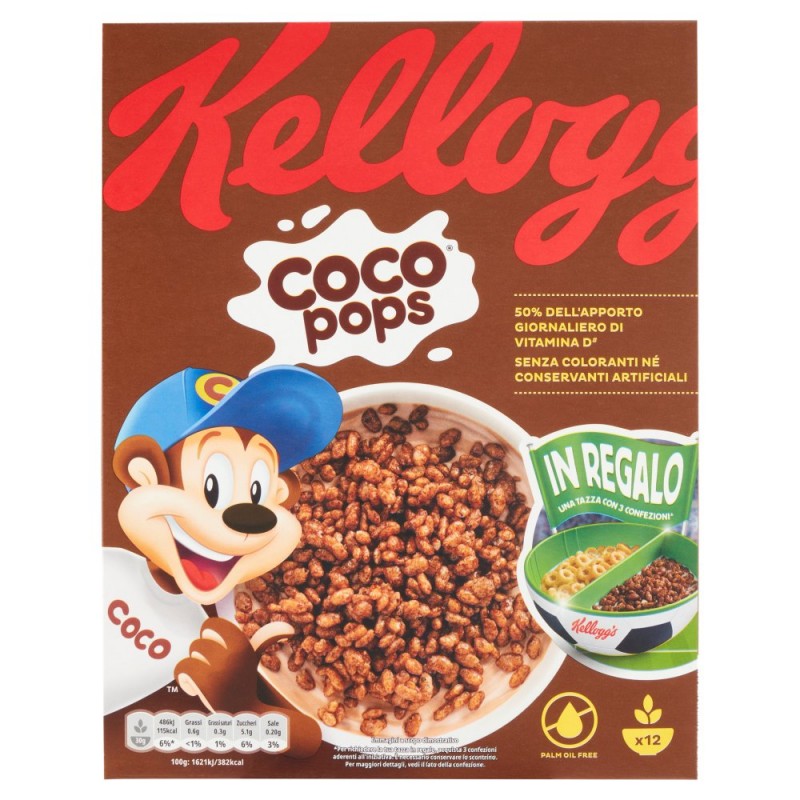 Adatto ai vegetariani / / Riso / Pieno di bonta'* / Senza coloranti ne' conservanti artificiali / *Fonte di vitamine (D, B1, B2, niacina, B6, acido folico e B12) e ferro. La vitamina D contribuisce al mantenimento di ossa normali. Gustali nell'ambito di una dieta varia ed equilibrata ed uno stile di vita sano. / Ingredienti: Riso, Sciroppo di glucosio, Zucchero, Cacao magro in polvere (4.4%), Pasta di cacao (1.4%), Sale, Estratto di malto d'orzo, Aromi, Vitamine e minerali: vitamine (niacina, B6, B2, B1, acido folico, D, B12) e ferro, Puo' contenere latte