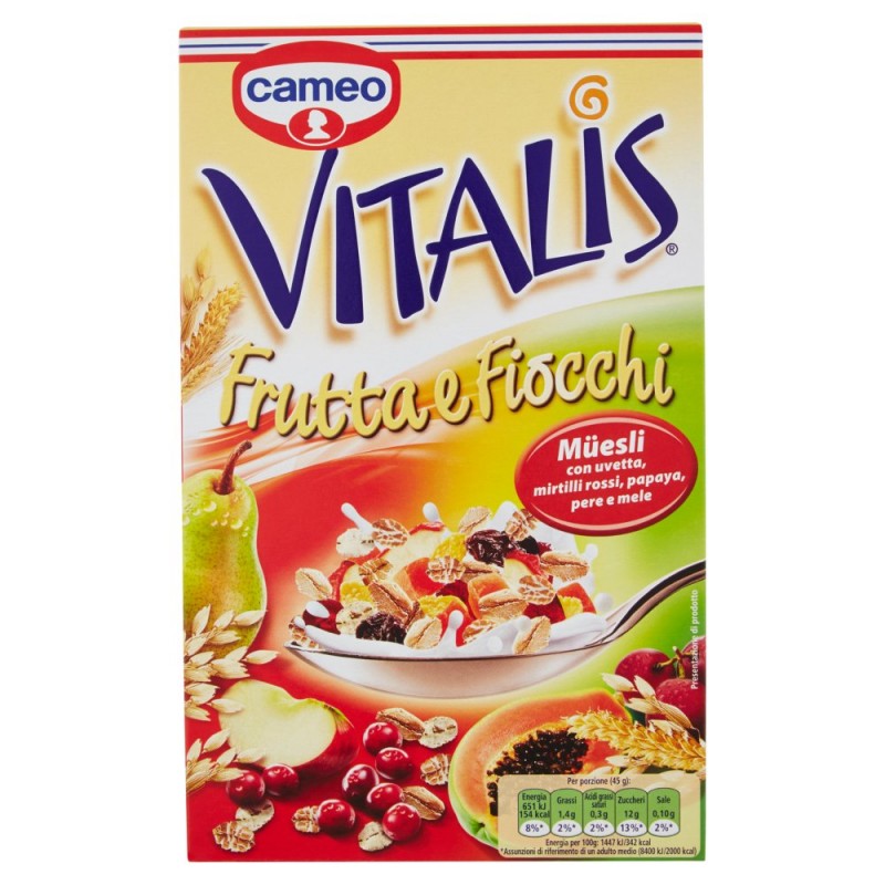 Inizia la giornata con il gusto di Vitalis Frutta e Fiocchi ! Fiocchi integrali di avena, frumento e orzo si uniscono alla bonta' di morbidi chicchi di uvetta, gustosi mirtilli rossi americani, dolci cubetti di papaya e di pere, fettine di mele. / / 53% di cereali integrali / / C'e' piu' gusto con Vitalis! / - Il gusto intenso della frutta: uvetta, mirtilli rossi americani, papaya, pere e mele. / - Una pregiata miscela di cereali integrali: fiocchi d'avena, frumento e orzo. / - Ricchi di fibre. / Ingredienti: Fiocchi integrali di avena 32%, Uvetta 20%, Fiocchi integrali di grano 11%, Fiocchi integrali di orzo 10%, Corn flakes (mais, zucchero, sale, estratto di malto d'orzo), Mirtilli rossi americani disidratati 5,4%, Zucchero, Pere disidratate in pezzi 3,8%, Papaya disidratata a cubetti 3,7%, Mele disidratate in pezzi 1,9%, Farina di riso, Antiossidante: acido ascorbico, Acidificante: acido citrico, Puo' contenere frutta a guscio, latte, soia