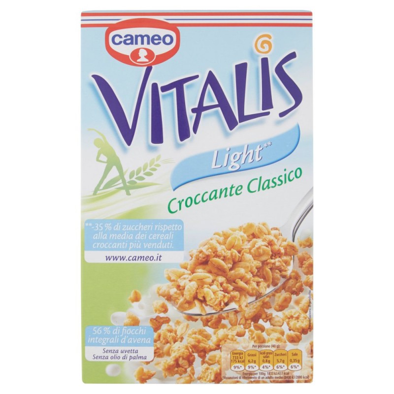 Inizia la giornata con la leggerezza di Vitalis Light Croccante Classico: croccanti cereali integrali tostati ricchi di gusto e con il **35% di zuccheri in meno rispetto alla media dei cereali croccanti piu' venduti. (www.cameo.it) / / 56% di fiocchi integrali d'avena / / C'e' piu' gusto con Vitalis! / - Dorati agglomerati di fiocchi d'avena particolarmente croccanti e gustosi grazie allo speciale processo di tostatura. / - Ricchi di fibre. / Ingredienti: Fiocchi integrali di avena 56 %, Olio di semi di girasole, Zucchero, Oligofruttosio, Germe di grano essiccato, Farina di riso, Sciroppo di glucosio, Farina integrale di grano tenero, Miele, Farina di grano tenero, Sale, Estratto di malto d'orzo disidratato, Latte scremato in polvere, Aroma, Puo' contenere frutta a guscio, soia