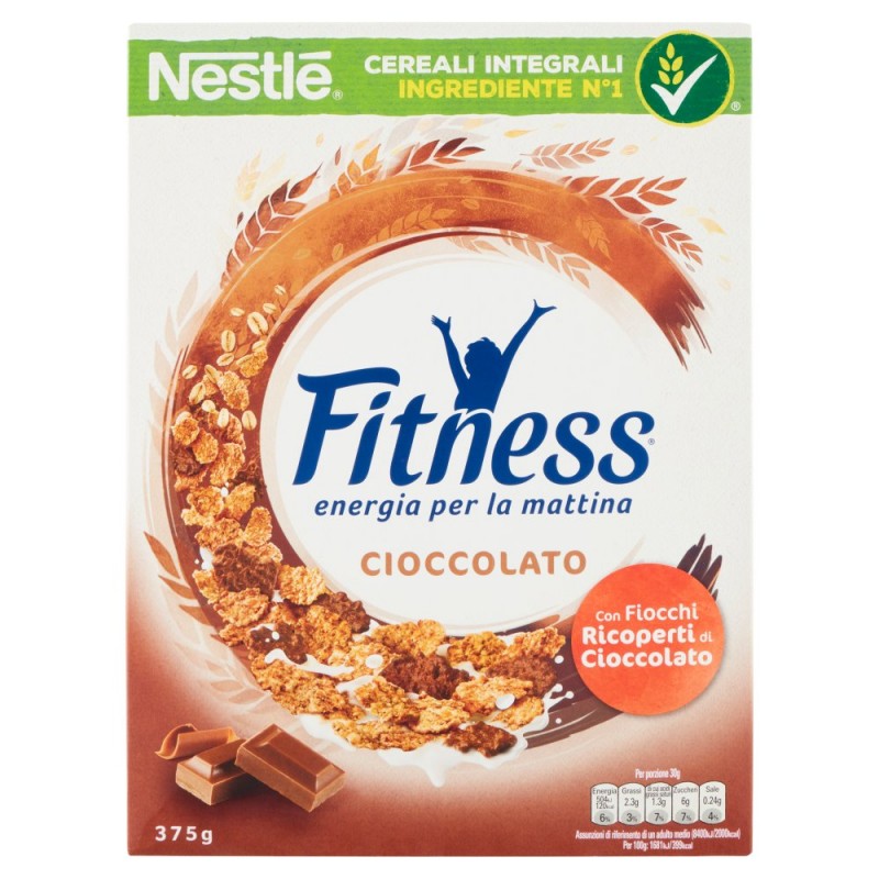 I fiocchi di FITNESS CIOCCOLATO sono fatti con frumento e avena 100% integrali e delizioso cioccolato per un mix perfetto di gusto ed energia. / / Fiocchi ricoperti di cioccolato / Frumento 100% integrale / Avena 100% integrale / Fonte di fibre / Solo aromi naturali e nessun colorante / Senza olio di palma / Con vitamine del gruppo B, calcio e ferro / Contiene circa 12 porzioni da 30g / / Per una colazione completa aggiungi ai cereali FITNESS: / - 125ml di latte scremato / - 1 bicchiere d'acqua / - 1 frutto fresco / - 1 fonte extra di proteine / Scegli FITNESS all'interno di una dieta varia ed equilibrata e di uno stile di vita sano. / / Inizia bene la giornata con i tuoi cereali FITNESS preferiti: ORIGINAL, CIOCCOLATO AL LATTE, CIOCCOLATO FONDENTE o FRUTTA. / Oppure prova la deliziosa gamma di FITNESS GRANOLA con la sua carica di gusto ed energia. / E per una gustosa colazione in movimento, prova tutti i gusti delle BARRETTE DI CEREALI FITNESS. / / Scopri tutti i prodotti NESTLE' Cereali su www.nestlecereals.com/it / Ingredienti: Frumento integrale 40,3%, Riso 29,6%, Avena integrale 5,6%, Cioccolato al latte 16,5% [zucchero, burro di cacao, latte in polvere, pasta di cacao, siero di latte in polvere, emulsionante lecitine (soia), aroma naturale di vaniglia], Zucchero, Cioccolato 4,1% [pasta di cacao, zucchero, burro di cacao, emulsionante lecitine (soia), aroma naturale di vaniglia], Sciroppo di zucchero di canna parzialmente invertito, Estratto di malto d'orzo, Vitamine e minerali: carbonato di calcio, niacina, ferro, acido pantotenico, vitamina B6, riboflavina, acido folico, Agente di rivestimento gomma arabica, Addensante polidestrosio, Sciroppo di glucosio, Sale, Antiossidante estratto ricco di tocoferolo, PUO' CONTENERE ARACHIDI, FRUTTA A GUSCIO