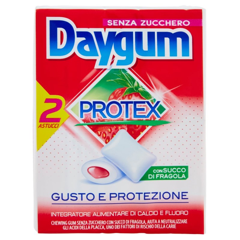 Piu' igiene orale / Meno rischio carie / Fuori casa, quando non c'e' lo spazzolino, Daygum Protex aiuta a proteggere i tuoi denti con gusto / / Succo di fragola / Xilitolo / Fluoro / Calcio / / - Chewing gum senza zucchero, con Xilitolo, aiuta a neutralizzare gli acidi della placca, uno dei fattori di rischio della carie. / - Con Fluoro, utile a mantenere la mineralizzazione dei denti. / - Con Calcio, che aiuta a mantenere i denti sani. / Ingredienti: Edulcoranti: xilitolo (20%), maltitolo, mannitolo, sorbitolo, sciroppo di maltitolo, aspartame, acesulfame K, sucralosio, Gomma base, Fosfato dicalcico, Succo di fragola (3,5%), Aromi, Maltodestrine, Amido, Succo di limone, Acidificante: acido malico, Emulsionanti: lecitine (soia), E473, Olio di cocco, Addensante: E466, Stabilizzante: E422, Fluoruro di potassio, Colorante: carminio, Agente di rivestimento: E903, Antiossidante: E321