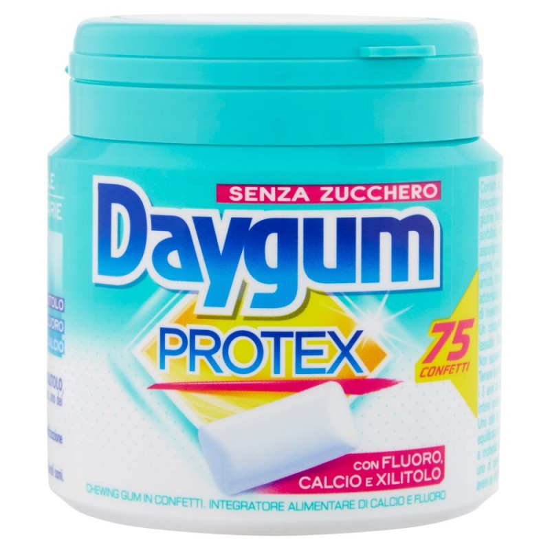 Piu' igiene orale / Meno rischio carie / / Xilitolo / Fluoro / Calcio / / - Chewing gum senza zucchero, con Xilitolo, aiuta a neutralizzare gli acidi della placca, uno dei fattori di rischio della carie. / - Con Fluoro, utile a mantenere la mineralizzazione dei denti. / - Con Calcio, che aiuta a mantenere i denti sani. / Ingredienti: Edulcoranti: xilitolo (30%), sorbitolo, mannitolo, sciroppo di maltitolo, aspartame, Gomma base, Carbonato di calcio, Aromi, Maltodestrine, Stabilizzante: E422, Amido, Emulsionanti: lecitine (soia), E473, Addensante: E466, Fluoruro di potassio, Agente di rivestimento: E903, Antiossidante: E321