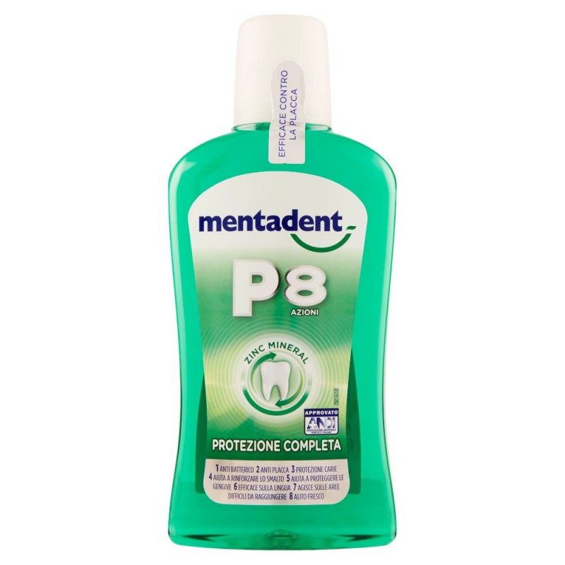 - 8 Azioni / 1. Anti batterico / 2. Anti placca / 3. Protezione carie / 4. Aiuta a rinforzare lo smalto / 5. Aiuta a proteggere le gengive / 6. Efficace sulla lingua / 7. Agisce sulle aree difficili da raggiungere / 8. Alito fresco / / La speciale formula di Mentadent P8 Azioni, contiene Zinc Mineral ed offre una protezione efficace e delicata per la tua bocca. La sua formula offre 8 efficaci azioni per prevenire i principali problemi orali. Per una protezione completa di denti e gengive, sciacquare la bocca con Mentadent P8 Azioni. Consigliato dopo l'utilizzo del dentifricio Mentadent P prevenzione completa. / / Approvato ANDI - Associazione Nazionale Dentisti Italiani / L'A.N.D.I. riconosce che un collutorio al fluoro correttamente formulato aiuta a prevenire la formazione di placca proteggendo la salute di denti e gengive. Mentadent P8 Azioni collutorio soddisfa questi requisiti ed e' quindi di significativa utilita' abbinato all'utilizzo di un dentifricio al fluoro e ad un corretto uso dello spazzolino. / / FDI World Dental Federation / FDI riconosce che utilizzare un collutorio al fluoro, come Mentadent P8 Azioni, puo' essere di significativa utilita' per una corretta igiene orale. / Ingredienti: Aqua, Alcohol, Hydrogenated Starch Hydrolysate, Glycine, Sodium Lauryl Sulfate, Poloxamer 188, Aroma, Zinc Sulfate, Sodium Fluoride, Sodium Saccharin, BHT, Eugenol, Limonene, Linalool, CI 16255, CI 42051, CI 47005, Contiene Fluoruro di Sodio (225 ppm F)