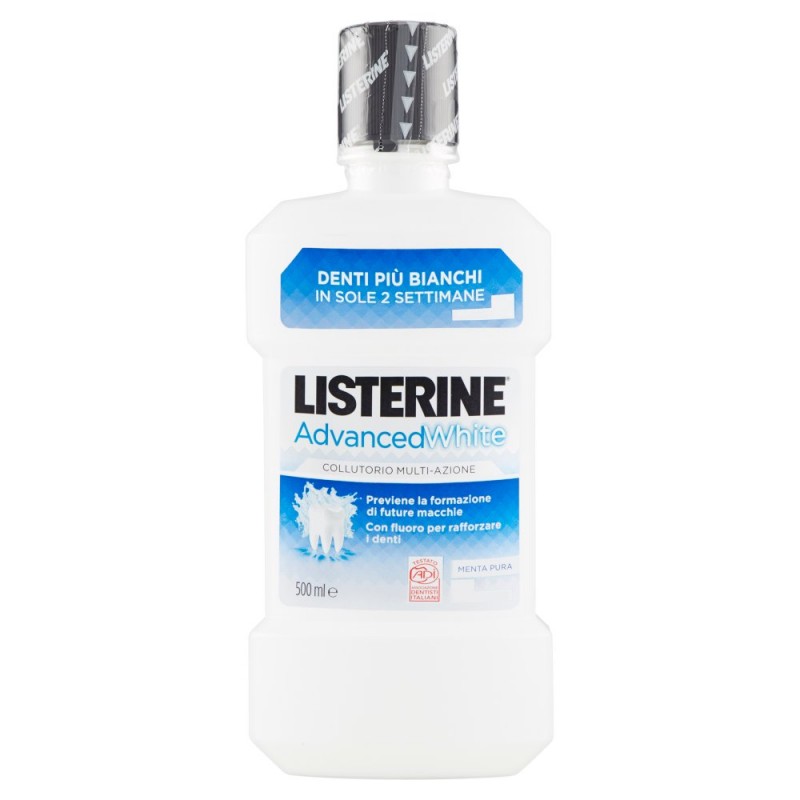 - E' provato: usato due volte al giorno, Listerine Advanced White rimuove e previene le macchie persistenti per denti piu' bianchi in sole 2 settimane. La sua esclusiva formula: / - Rimuove le macchie dai denti grazie alla sua tecnologia sbiancante non abrasiva / - Crea uno scudo protettivo che aiuta a prevenire la formazione di nuove macchie / - Gli Oli Essenziali penetrano e riducono i batteri causa della placca per pulire la superficie del dente / - Il fluoro remineralizza e rinforza i denti / Ingredienti: Aqua, Alcohol, Sorbitol, Tetrapotassium Pyrophosphate, Pentasodium Triphosphate, Citric Acid, Poloxamer 407, Sodium Benzoate, Eucalyptol, Thymol, Menthol, Sodium Saccharin, Sodium Fluoride, Tetrasodium Pyrophosphate, Propylene Glycol, Sucralose, Aroma, Disodium Phosphate, Contiene Fluoruro di Sodio (220 ppm F)