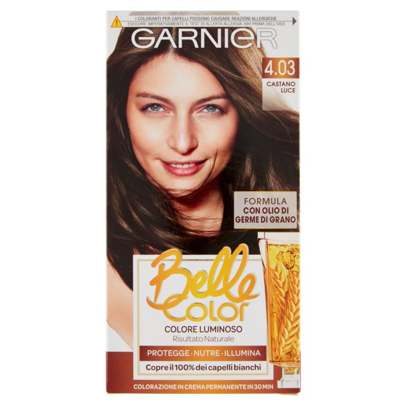 Cosi' naturale che non puoi sbagliare. Risultato naturale garantito. A differenza di altre colorazioni, Garnier Belle Color, grazie agli agenti riflessanti, rispetta ed esalta le sfumature naturali dei capelli per un risultato armonioso e un colore luminoso. Ricco di sfumature e senza effetto casco, il colore e' cosi' naturale che sembra il tuo! La sua formula in crema color facile si applica come uno shampoo, per una distribuzione facile e uniforme. E con un tempo di posa di soli 20 minuti copre il 100% dei capelli bianchi. / Ingredienti: Aqua / Water, Deceth-3, Laureth-12, Cocamide MIPA, Oleth-30, Ammonium Hydroxide, Deceth-5, Glycerin, Oleic Acid, Oleyl Alcohol, Hexadimethrine Chloride, 2,4-Diaminophenoxyethanol HCl, m-Aminophenol, Ascorbic Acid, Hydroxyethylcellulose, Hydroxybenzomorpholine, Sodium Acetate, Sodium Chloride, Ethanolamine, Triticum Vulgare Germ Oil / Wheat Germ Oil, Polyquaternium-6, Polyquaternium-67, Ammonium Thiolactate, Simmondsia Chinensis Seed Oil / Jojoba Seed Oil, Isopropyl Alcohol, p-Phenylenediamine, Resorcinol, EDTA, Parfum / Fragrance, (F.I.L. C177307/2)