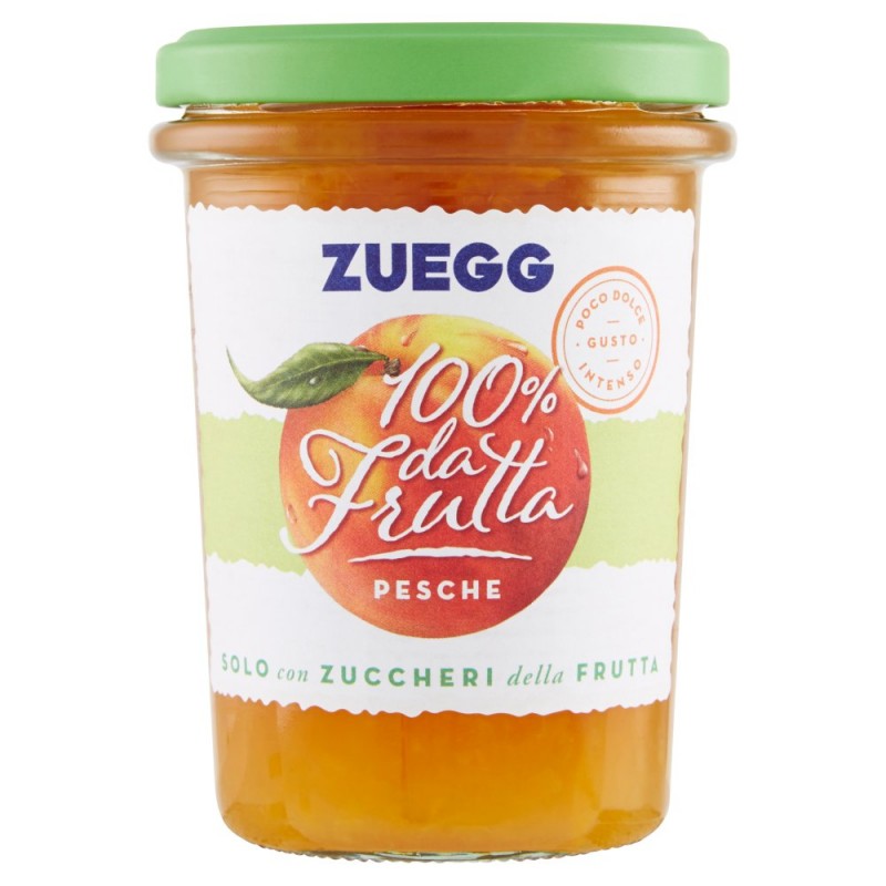 - Per preparare questa ricetta Zuegg abbiamo aggiunto alla frutta solo zuccheri d'uva. / Per questo ha un sapore intenso e naturalmente dolce, per questo e' 100% da Frutta. / Ingredienti: Pesche 60%, Zucchero d'uva, Gelificante: pectina di frutta, Succo di limone concentrato