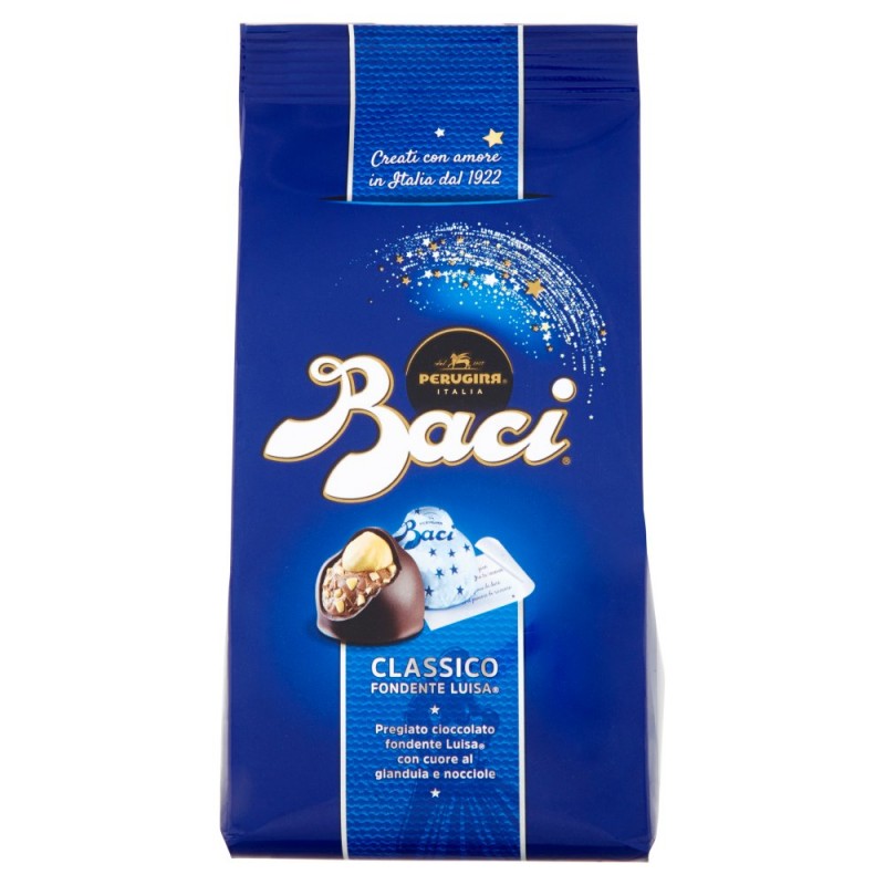 BACI PERUGINA Classico Fondente LUISA prende il nome dalla sua creatrice, Luisa Spagnoli, che con la sua semplicita' creo' un cioccolatino unico: un morbido cuore al gianduia e granella di nocciola, la croccante nocciola intera, avvolti da una doppia copertura di pregiato cioccolato fondente Luisa. Un piccolo capolavoro che custodisce un messaggio… il modo con cui gli italiani, da sempre, esprimono amore ed affetto. / / - Raffinata selezione di cioccolatini con cuore al gianduia e nocciole / - Ideale per un regalo o per consumo personale / - Cioccolato con puro cacao e nocciole scelte e tostate con cura / - Materie prime selezionate / - Solo vaniglia naturale / - Senza glutine / - Ogni cioccolatino custodisce un messaggio d'amore e d'affetto / / Prova anche BACI PERUGINA nei gusti FONDENTISSIMO 70%, LATTE e BIANCO. / / Scopri tutti i prodotti BACI PERUGINA su www.baciperugina.it / / BACI PERUGINA aderisce al progetto NESTLE' Cocoa Plan in collaborazione con UTZ per migliorare la vita dei coltivatori e la qualita' dei loro prodotti. Scopri di piu' su www.nestlecocoaplan.com / Ingredienti: Zucchero, Nocciole 29%, Pasta di cacao, Burro di cacao, Latte in polvere, Burro anidro, Emulsionante lecitine di girasole, Aroma naturale di vaniglia, Puo' contenere altra frutta a guscio, Senza glutine