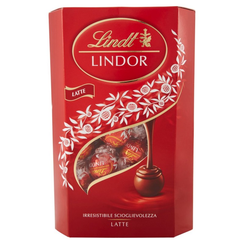 Concediti un momento solo per te. / Abbandonati al morbido cuore di Lindor, racchiuso nel finissimo guscio di cioccolato. / Lindor ti riempira' il cuore con la sua irresistibile scioglievolezza. / Goditi un momento Lindor ogni volta che vuoi. / / Lindor: / creato dai Maîtres Chocolatiers Lindt. / Passione per il cioccolato dal 1845. / Ingredienti: Zucchero, Grasso vegetale (cocco, palmisti), Burro di cacao, Pasta di cacao, Latte intero in polvere, Latte scremato in polvere, Lattosio, Burro anidro, Emulsionante (lecitina di soia), Estratto di malto d'orzo, Aromi, Puo' contenere nocciole ed altra frutta a guscio, Esterno: cioccolato al latte - Cacao: 31% minimo