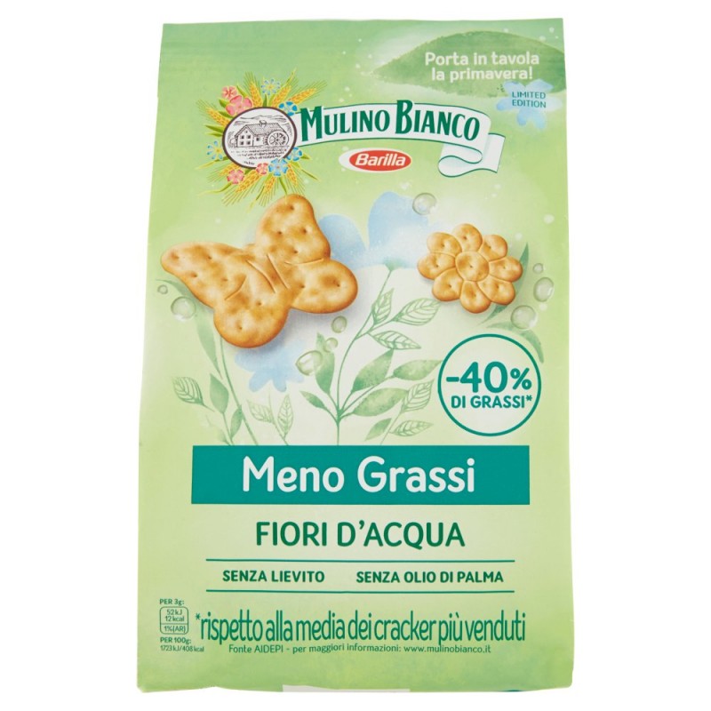 - Tutto il buono che senti / I Fiori d'Acqua hanno una ricetta semplice, a ridotto contenuto di grassi, grazie al particolare metodo di preparazione che utilizza molta acqua nell'impasto. / La ricetta dei Fiori d'Acqua e' preparata senza l'aggiunta di lievito e custodisce tutta la semplicita' della farina di frumento e dell'olio di oliva. / Lo spuntino perfetto con tutto il gusto che ti aspetti da Mulino Bianco! / / -40% di grassi* / Fonte di fibra / 12 Kcal per Cracker / *rispetto alla media dei cracker piu' venduti. Fonte Aidepi. / / Variare spesso i cibi e seguire uno stile di vita fisicamente attivo e' il modo giusto per avere una vita sana / Ingredienti: Farina di frumento, Acqua 28,9%, Olio di oliva 5,8%, Estratto di malto d'orzo e mais, Sale, Correttore di acidita': carbonato acido di sodio, Puo' contenere tracce di: frutta a guscio, latte, soia e uova