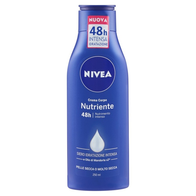 - Texture: 5 su 5 / / Dona un nutrimento profondo alla pelle molto secca e la rende visibilmente piu' morbida per 48h / - Nivea Crema Corpo Nutriente e' arricchita con Nivea Siero Idratazione Intensa e Olio di Mandorla x2.* / - Nutre intensamente la pelle molto secca per 48h e la rende morbida e liscia- dopo una sola applicazione. / *rispetto alla formula precedente / / Siero Idratazione Intensa / La formula mantiene l'idratazione in profondita', per una pelle visibilmente piu' morbida per 48h. Formula senza parabeni. / Ingredienti: Aqua, Paraffinum Liquidum, Isohexadecane, Glycerin, Isopropyl Palmitate, Cera Microcristallina, PEG-40 Sorbitan Perisostearate, Polyglyceryl-3 Diisostearate, Prunus Amygdalus Dulcis Oil, Magnesium Sulfate, Sodium Citrate, Citric Acid, Potassium Sorbate, Linalool, Limonene, Benzyl Alcohol, Geraniol, Citronellol, Butylphenyl Methylpropional, Alpha-Isomethyl Ionone, Parfum
