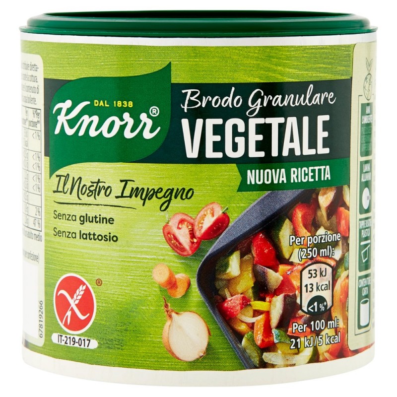 Con pochi grassi. / / Il Nostro Impegno / Con olio di oliva / Senza conservanti / Senza glutine / Senza lattosio / Ingredienti: Sale, Esaltatore di sapidita': glutammato monosodico, Maltodestrine, Zucchero, Cipolle¹ 4%, Estratto di lievito, Carote¹ 0,8%, Spezie (semi di sedano in polvere, curcuma), Aromi (contengono sedano), Purea di pomodori in polvere¹ 0,5%, Porro¹, Olio d'oliva 0,2%, Prezzemolo¹, Succo di limone in polvere¹, ¹Da agricoltura sostenibile