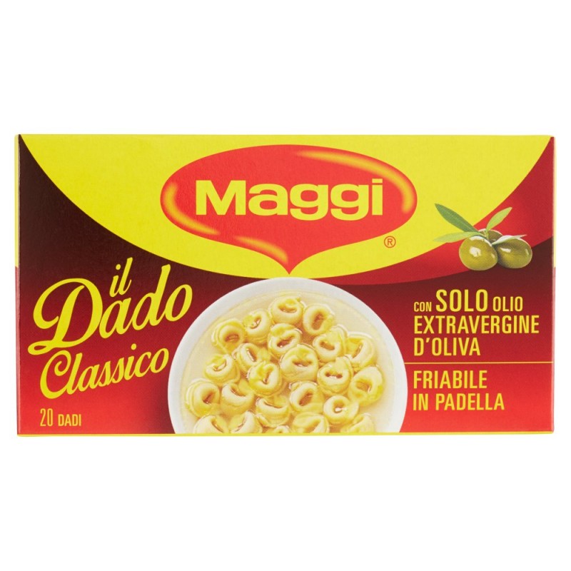 - Dai piu' sapore a tutte le tue ricette aggiungendo il DADO MAGGI CLASSICO. / / - Il DADO MAGGI CLASSICO e' ideale per la preparazione di un brodo gustoso e saporito / - Provalo anche per insaporire le tue verdure da saltare in padella o in sostituzione del sale / - Gusto classico / - Con sale iodato / - Con solo olio extravergine d'oliva / - Solo 0,1% di grassi per 100ml di brodo preparato sciogliendo 1 dado in 500ml di acqua / - Friabile in padella / - 20 tavolette / / Prova la friabilita' del DADO MAGGI CLASSICO in padella con una ricetta semplice e gustosa, come gli Involtini di pollo. / / INVOLTINI DI POLLO / / INGREDIENTI: / DADO MAGGI CLASSICO 1 / Petto di pollo 8 fette / Prosciutto cotto 8 fette / Fontina 8 fette / Asparagi 8 / Farina q.b. / Burro q.b. / / PREPARAZIONE: / Stendete 8 fette di petto di pollo, disponete sopra ad ognuna una fetta di prosciutto cotto, una fetta di fontina e un asparago sbollentato. Create degli involtini e chiudeteli con uno stecchino, passateli nella farina e fateli rosolare in padella con del burro. Sbriciolate sopra gli involtini 1 DADO MAGGI CLASSICO, versate ½ bicchiere di acqua calda e continuate la cottura a fuoco basso per 10 min. Servite gli involtini con contorno di patate e verdure lessate. / / Utilizza il DADO MAGGI CLASSICO con BUITONI RIPIENI TRADIZIONALI Cappelletti al Prosciutto Crudo per realizzare un primo piatto gustoso. / / Scopri tutte le ricette su www.buonalavita.it / Ingredienti: Sale iodato, Sciroppo di glucosio, Esaltatori di sapidita' glutammato monosodico - inosinato disodico - guanilato disodico, Olio extravergine di oliva 5%, Zucchero, Colorante caramello, Verdure disidratate (cipolla, carota, prezzemolo), Aromi, Acidificante acido citrico, Puo' contenere glutine, latte, uova, soia, sedano e pesce
