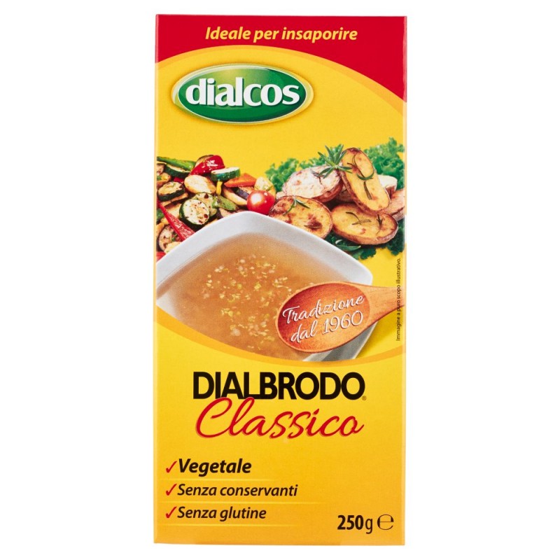Dialbrodo Classico e' il preparato granulare istantaneo vegetale ottenuto a partire da ortaggi freschi disidratati e aromi naturali, pensato per brodi e minestre piu' gustosi, ma anche per insaporire sughi, contorni, verdure grigliate, carne e pesce. Un amico ai fornelli per rendere piu' appetitosa la tua tavola! / / Dal 1960 Dialbrodo e' l'amico fidato protagonista della buona tradizione in cucina e da sempre capace di esaltare i piatti piu' diversi con il suo inconfondibile sapore. / Ingredienti: Sale, Esaltatore di sapidita': glutammato monosodico, Ortaggi disidratati in prop. var. 8,7% (cipolla, sedano), Lattosio, Aromi naturali (contengono sedano), Olio di semi di mais, Colorante: caramello semplice