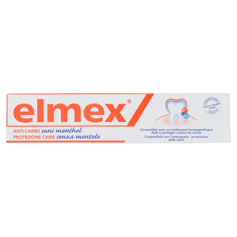 - rimineralizza i denti e li protegge dalla carie / - sviluppato in collaborazione con professionisti omeopati / / Cosa rende elmex senza mentolo differente? / Il dentifricio elmex senza mentolo con lo speciale principio attivo fluoruro amminico non contiene mentolo o olio di menta piperita ed e' quindi compatibile con la medicina omeopatica. / Chiedi al tuo dentista / igienista o omeopata / Ingredienti: Aqua, Sorbitol, Hydrated Silica, Hydroxyethylcellulose, Olaflur, Aroma, Saccharin, Limonene, CI 77891