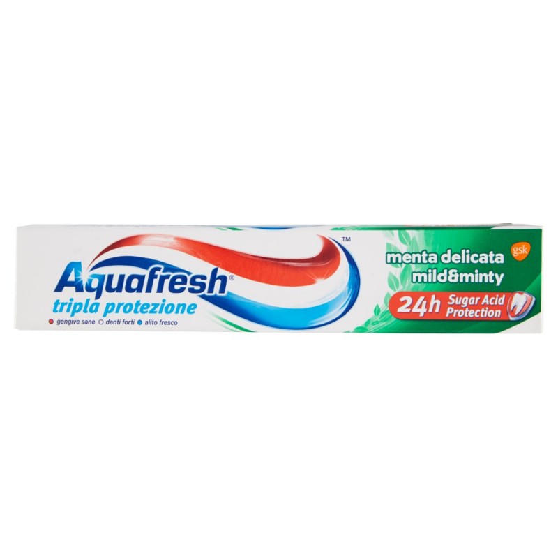 Il dentifricio Aquafresh Tripla Protezione Menta Delicata e' un dentifricio 3-in-1 dal gusto delicato per la famiglia, con 24 ore di Sugar Acid Protection fornita dal fluoro* che aiuta a proteggere dagli acidi degli zuccheri presenti nella placca, la principale causa della carie. / / Quando ti lavi i denti, a livello microscopico i minerali attivi vengono assorbiti dai tuoi denti, rinforzandoli. Cio' crea uno scudo protettivo che aiuta a bloccare l'attacco degli acidi derivati dagli zuccheri per tutto il giorno*. / / Tripla protezione per cio' che conta davvero / / *spazzolando i denti due volte al giorno / Ingredienti: Aqua, Hydrated Silica, Sorbitol, Glycerin, Sodium Lauryl Sulfate, Xanthan Gum, Aroma, Titanium Dioxide, PEG-6, Sodium Fluoride, Sodium Saccharin, Carrageenan, Limonene, CI 73360, CI 74260, CI 74160, Contiene: Fluoruro di Sodio (1450ppm Fluoruro)