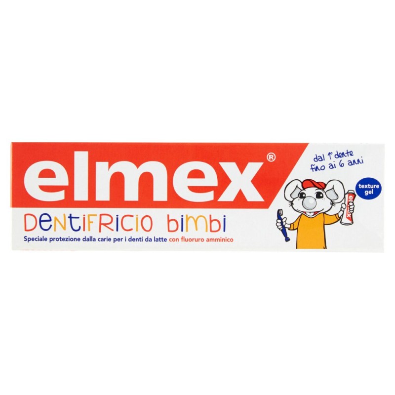 - Il Dentifricio elmex Bimbi e' un dentifricio adatto dal primo dente fino ai 6 anni. I denti da latte hanno bisogno di protezione e cure: la loro funzione e' di occupare lo spazio in cui spunteranno i denti permanenti, prerequisito per mantenerli sani. Il dentifricio elmex bimbi contiene fluoruro amminico per un triplice effetto protettivo: / - crea una barriera protettiva di fluoruro di calcio sullo smalto dentale; / - rende i denti piu' resistenti alla perdita minerale dovuta alla carie; / - aiuta a reincorporare i minerali dissolti dalla carie. / Ingredienti: Aqua, Sorbitol, Hydrated Silica, Hydroxyethylcellulose, Cocamidopropyl Betaine, Olaflur, Aroma, Saccharin