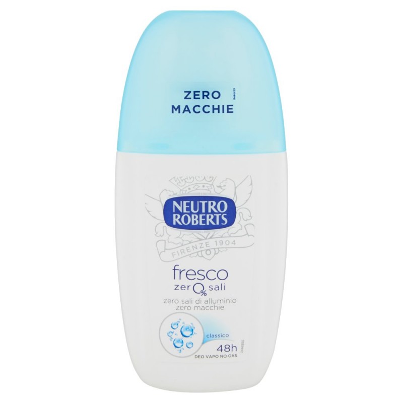 Zero sali - Zero macchie* / Neutro Roberts sceglie 0% sali di alluminio perche': / - I sali di alluminio ostacolano la naturale traspirazione della pelle. / - I sali di alluminio sono la principale causa di macchie bianche sui vestiti. / Scegli Neutro Roberts, scegli di far respirare la tua pelle senza macchie* sui vestiti. / * Formula senza polveri che garantisce l'assenza di residui visibili e permanenti sui vestiti. / Ingredienti: Alcohol Denat., Propylene Glycol, Glycerin, Aqua, Triethyl Citrate, Parfum, Diisopropyl Adipate, Pentylene Glycol, Dimethyl Phenylpropanol, Panthenol, Tocopheryl Acetate, Menthol, BHT, Thymus Vulgaris Oil, Eucalyptus Globulus Leaf Oil, Benzyl Salicylate, Cinnamyl Alcohol, Coumarin, Citral, Citronellol, Geraniol, Hexyl Cinnamal, Limonene, Linalool, Butylphenyl Methylpropional, Eugenol