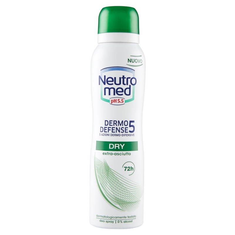- Dermo Defense 5 / Dall'esperienza Neutromed nasce Dermo Defense 5, il deodorante con 5 azioni dermo-difensive, per difendere efficacemente la tua pelle fino a 72 h. La sua formula dermatologicamente testata rispetta il pH fisiologico e ti garantisce: / 1 azione anti-odore / 2 effetto asciutto / 3 extra delicatezza / 4 efficacia anti-irritazioni / 5 equilibrio della pelle / / Dry extra-asciutto / La sua formula ad alta performance regola la traspirazione fino a 72 h e offre un controllo eccezionale del sudore anche in condizioni estreme. 0 % Alcool. / Ingredienti: Butane, Propane, Cyclomethicone, Aluminum Chlorohydrate, Isobutane, Ethylhexyl Palmitate, Parfum, Isopropyl Myristate, Disteardimonium Hectorite, Triethyl Citrate, Propylene Carbonate, Potassium Alum, Benzyl Alcohol, Limonene, Geraniol, Alpha-Isomethyl Ionone