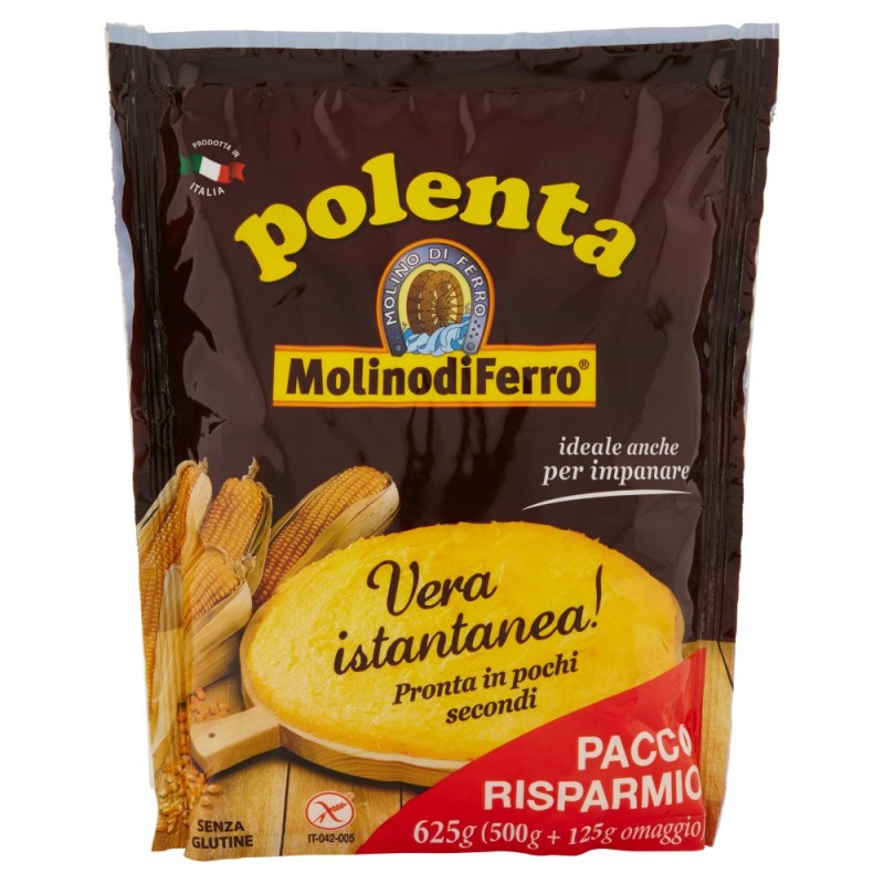 Ideale anche per impanare / La farina di questa confezione e' ideale anche per l'impanatura di filetti di pesce e fettine di carne preventivamente immerse nel latte o uovo sbattuto. / / Senza conservanti, a basso contenuto di grassi e cotta a vapore nel pieno rispetto delle sue proprieta' nutritive, la polenta Molino di Ferro e' una preziosa alleata in cucina per la sua velocita' e praticita' di preparazione. / Al naturale, alla griglia o fritta la polenta Molino di Ferro accompagna benissimo formaggi teneri e stagionati, funghi e salumi. Ottima con sughi e carni. Facilmente digeribile, assolutamente gustosa e gratificante. / Ingredienti: Farina gialla di mais