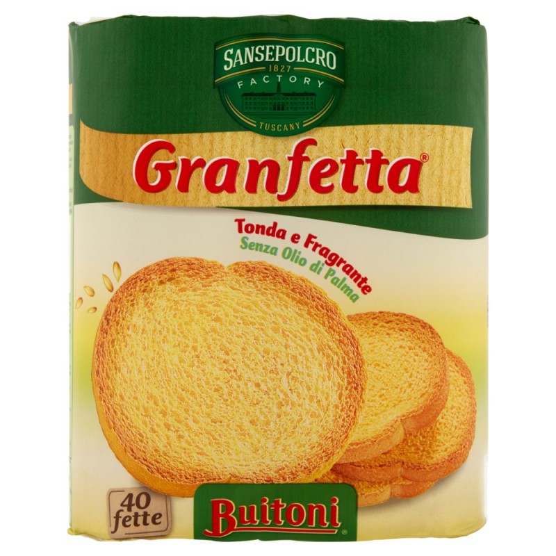 Buono a sapersi / La Granfetta, preparata solo con ingredienti naturali, leggera e digeribile, contribuisce ad offrire al tuo organismo una carica di energia per iniziare bene la giornata. / / Un Appuntamento Quotidiano con il Benessere / Per cominciare la giornata e' necessaria una prima colazione che fornisca circa il 20% del fabbisogno energetico giornaliero, apportando dalle 300 alle 400 calorie circa, in base all'attivita' svolta. / Con le Fette Biscottate scegli la tua colazione: / Colazione leggera / Quattro Granfetta, spalmate con un velo di marmellata, una tazza di cappuccino con due cucchiaini di zucchero, una mela. / Colazione energetica / Cinque Granfetta, spalmate con burro e marmellata, una tazza di te' con due cucchiaini di zucchero, una coppetta di frutti di bosco. / / Le fette rotonde piu' pratiche da spalmare / Il modo piu' comodo per spalmare le tue fette biscottate senza rischio di romperle, e' di farlo sovrapponendone 2 o 3, una sull'altra. / La tipica forma rotonda delle fette consente di spalmarle facilmente su tutta la superficie. / Ingredienti: Farina di frumento, Olio di girasole, Destrosio, Lievito, Estratto di malto (da orzo e mais), Sale, Puo' contenere tracce di latte e soia