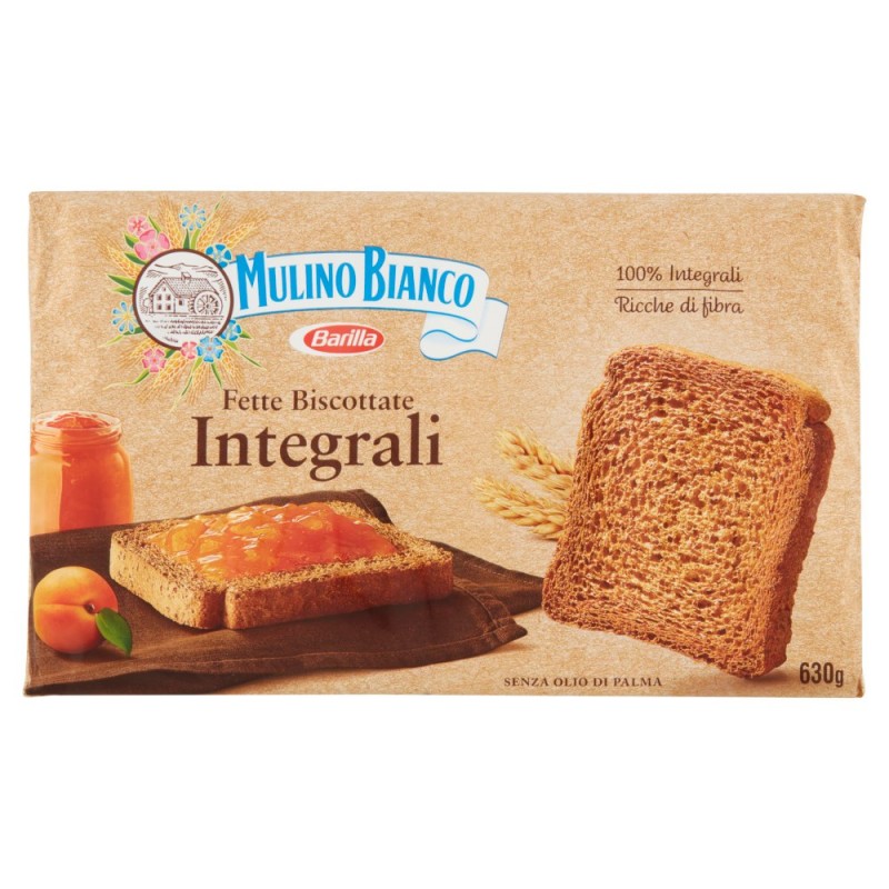 Tutto il buono che senti / - Farina integrale di grano tenero con crusca a foglia larga / Solo farina integrale con crusca a foglia larga, una perfetta combinazione ricca di fibra e di gusto, ideale per la tua colazione 100% Integrale e 100% buona. / / Il buono che non vedi / - Le nostre Fette Biscottate Integrali sono senza grassi idrogenati e senza coloranti. / - Le nostre Fette Biscottate Integrali sono preparate solo con materie prime accuratamente selezionate e controllate. / - Le nostre Fette Biscottate Integrali sono preparate solo con farina integrale di frumento, senza usare altri tipi di farine, e sono ricche di fibra. / www.mulinobianco.it / / Variare spesso i cibi e seguire uno stile di vita fisicamente attivo e' il modo giusto per avere una vita sana. / Ingredienti: Farina integrale di grano tenero 99g*, Lievito, Olio di girasole, Destrosio, Sale, Estratto di malto d'orzo e mais, Farina di frumento maltato, *per 100 grammi di prodotto finito, Puo' contenere tracce di: frutta a guscio, latte, sesamo, soia e uova