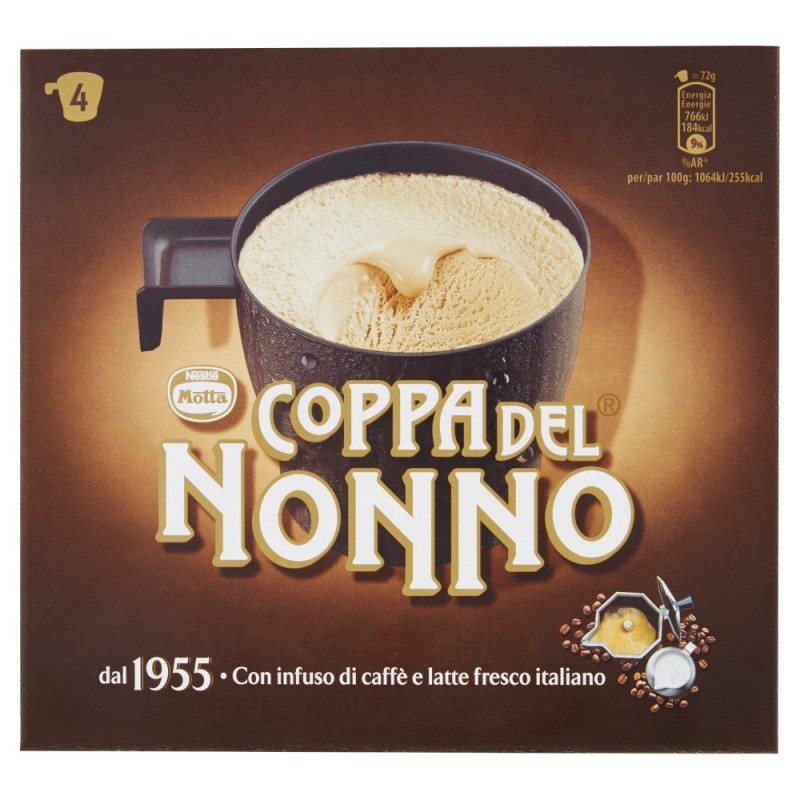 - Il Piacere del Caffe' / Un'antica ricetta trasforma i grani di caffe' verde ancora grezzi in chicchi tostati e macinati, per creare un infuso dall'aroma intenso. / Unico e Inimitabile / Un marchio senza tempo, amato da tutti. Dietro ad ogni cucchiaino c'e' il sapore della tradizione. / Rispetto dell'ambiente / Un passato da tramandare con uno sguardo sempre rivolto al futuro. Coppa del Nonno viene prodotta in uno stabilimento alimentato da energia rinnovabile per un mondo piu' sostenibile. / / - Dal 1955 - Con infuso di caffe' e latte fresco italiano / Ingredienti: LATTE fresco pastorizzato scremato (italiano) (32,5%), PANNA, Zucchero, BURRO, Infuso di caffe' (8%), LATTE scremato in polvere, Tuorlo D'UOVO, Sciroppo di glucosio, Destrosio, Emulsionante mono- e digliceridi degli acidi grassi, Addensanti farina di semi di carrube - gomma di guar - carragenina, PUO' CONTENERE FRUTTA A GUSCIO, SENZA GLUTINE